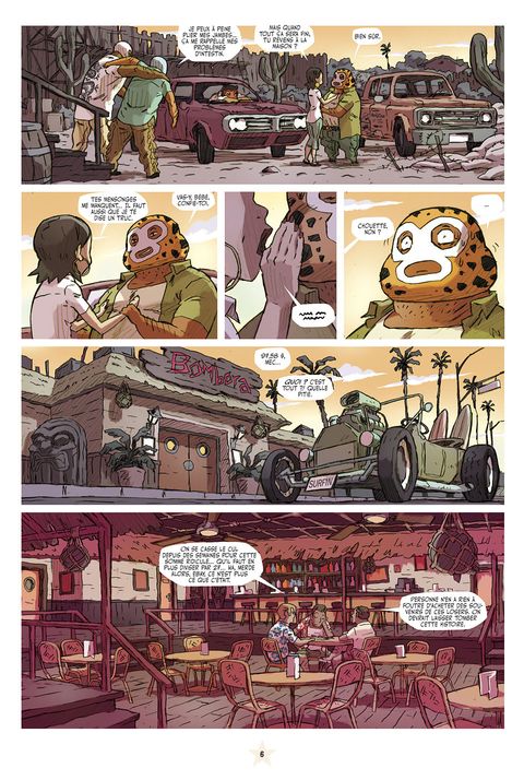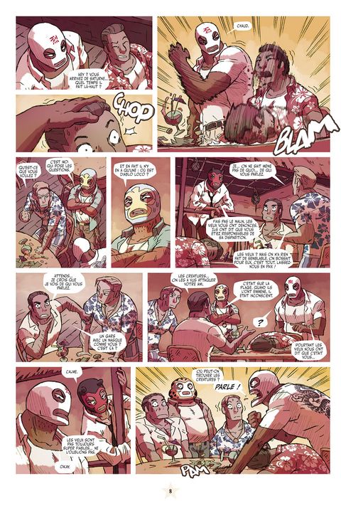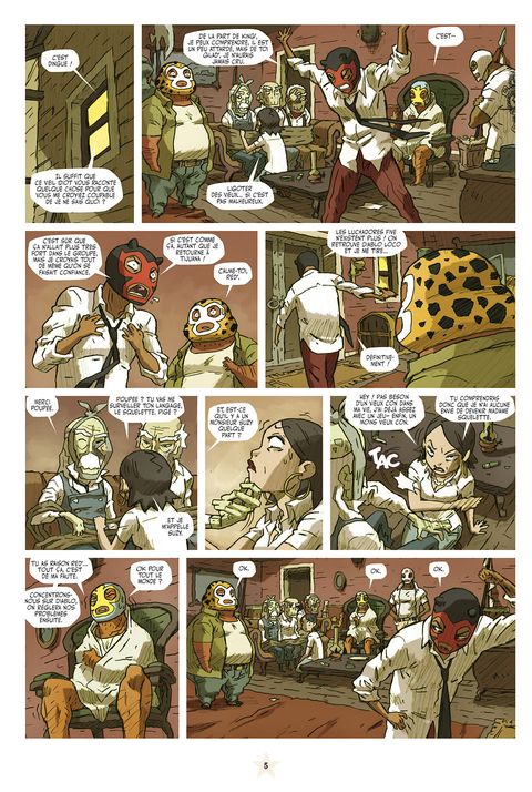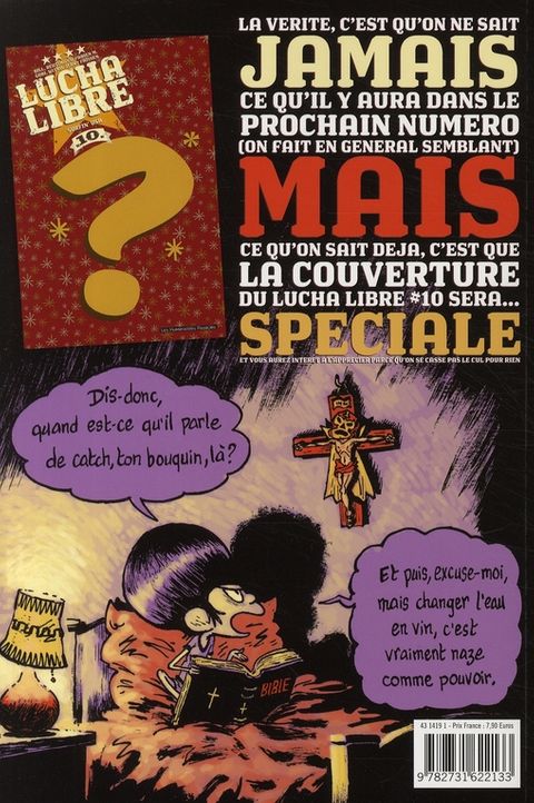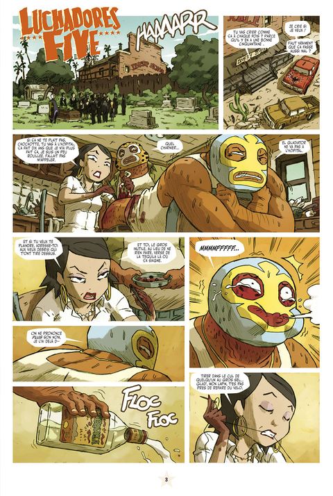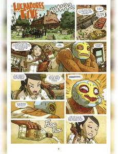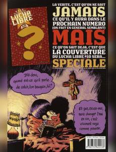 Voici déjà le neuvième numéro de Lucha Libre. Dans ce numéro, grâce à de multiples pirouettes scénaristiques, ce sera la fi n de la deuxième histoire des LUCHADORES. On y apprendra qu'El Gladiator n'est pas mort, enfi n pas tout à fait. De son côté, TEQUILA continue sa descente aux enfers de la culture redneck, alcool, moteur, viande et dégénérescence cérébrale. Les TIKITIS quant à eux se retrouvent à bord d'une galère grecque au beau milieu du Pacifique, berceau de toutes les civilisations... paraît-il. Pas de Lucha Libre sans l'abominable PROFESOR FURIA qui continue à exploiter ses élèves à tous les niveaux. Un changement pourtant dans ce numéro. Sous une élégante couverture d'Hervé Tanquerelle, ce sera la dernière participation de ce dernier à Lucha Libre. Sur les huit pages des LUCHADORITOS, six seront signées par son remplaçant, l'extraordinaire Romuald Reutimann.