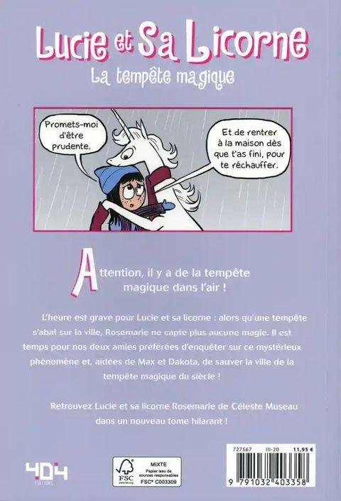 Retrouvez Lucie et Rosemarie pour de nouvelles aventures magiques !Attention, il y a de la tempête magique dans l'air !L'heure est grave pour Lucie et sa licorne : alors qu'une tempête s'abat sur la ville, Rosemarie ne capte plus aucune magie. Il est temps pour nos deux amies préférées d'enquêter sur ce mystérieux phénomène et, aidées de Max et Dakota, de sauver la ville de la tempête magique du siècle !Retrouvez Lucie et sa licorne Rosemarie de Céleste Museau dans un nouveau tome hilarant !