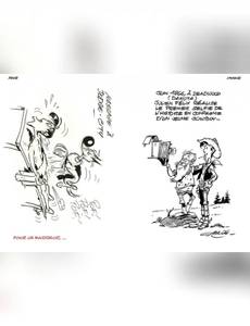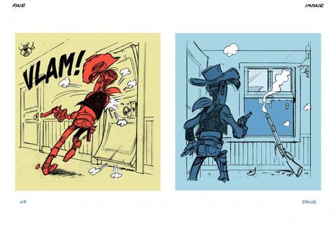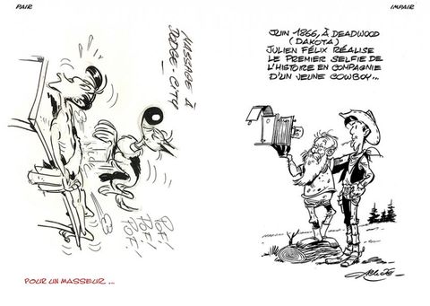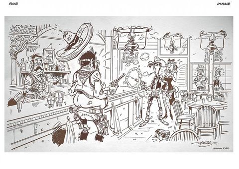 « Un rapide aperçu des milliers de petits dessins que jai pu gratter pour animer mon petit «Western de papier». Croyez-moi, en près de 20 ans, aprés dix albums de Lucky Luke, cinq de Kid Lucky, des dizaines de campagnes publicitaires et des milliers de dédicaces, il y en a eu ! en voici quelques modestes traces...» (Achdé)