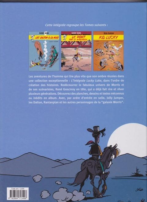 Trois "classiques" de Lucky Luke dessinés par Morris à partir d'histoires signées Fauche et Léturgie pour Les Dalton à la noce et Le Pont sur le Mississipi... Quant à Kid Lucky, c'est une aventure unique publiée en 1997, à l'occasion du cinquantième anniversaire des aventures du "Cowboy solitaire". On y découvre un enfant qui n'est autre que le petit Lucky... Signée Léturgie, elle est réalisée avec la collaboration de Pearce, un pseudonyme derrière lequel se dissimule Didier Conrad. Cette intégrale comprend LES DALTON À LA NOCE / LE PONT SUR LE MISSISSIPI / KID LUCKY