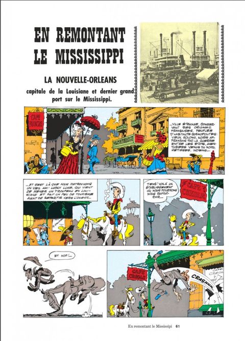 **En remontant le Mississippi (1961)** "En remontant le Mississippi" voit Lucky Luke embarquer sur un bateau à aubes pour remonter le fleuve et affronter des dangers variés. Ce tome offre une aventure riche en péripéties et en rencontres improbables, le tout dans le cadre pittoresque du Mississippi. Les dessins de Morris (...) Voir le commentaire