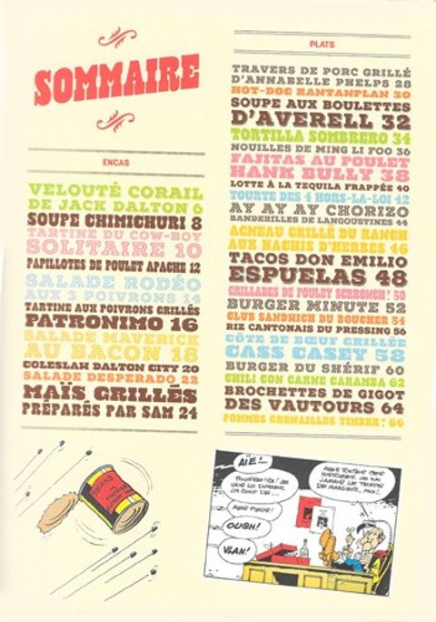 Saviez que Lucky Luke était gourmand et que son plat préféré était les patates au lard ? Au menu de cet ouvrage inédit : les tortillas de Joe Dalton, la lemon pie de Ma Dalton, le gâteau de Calamity Jane, la salade de cactus de Rantanplan ou encore les bonbons de Billy the Kid... et bien d'autres mets rares, issus de l'univers créé par Morris - et dûment élaborés par ses personnages ! Et comme dirait Avrell : « Quand est-ce qu'on mange ? »