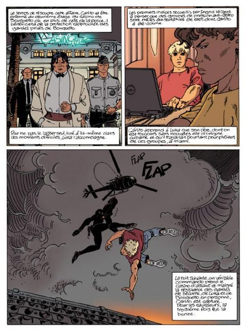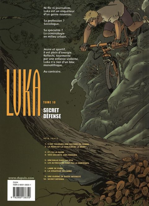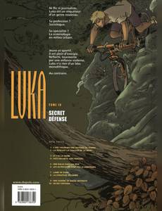 Luka était en charge de la protection de Carlito Quaranta, jeune footballeur d'origine cubaine, quand se dernier est enlevé par des agents de la C.I.A. Les hommes en noir entendent utiliser l'adolescent comme monnais d'échange contre son père, anticastriste de façade, procastriste dans l'âme. Luka a le choix entre la diplomatie et la manière forte pour lui rendre sa liberté. Il n'hésite pas longtemps... Une course poursuite rythmée où les bonnes et mauvaises raisons des uns et des autres se heurtent à la raison d'État. Dans ce dixième volume des aventures de "Luka", Denis Lapière met fin au suspense qu'il avait installé dans le précédent volume, Une guerre de basse intensité. Gilles Mezzomo illustre cette aventure d'un trait nerveux et généreux. Avec Secret défense, les auteurs imposent "Luka" comme une des séries d'action de référence de la collection "Repérages".