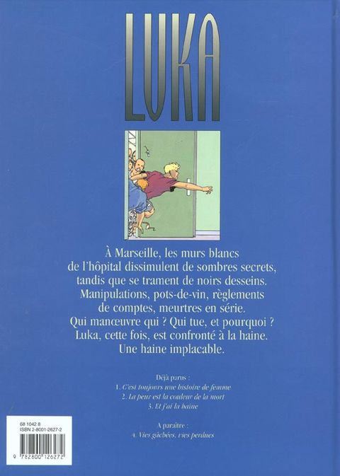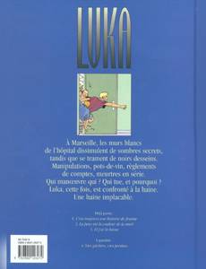 A marseille, les murs blancs de l'hôpital dissimulent de sombres secrets, tandis que se trament de noirs desseins. Manipulations, pots-de-vin, règlements de comptes, meurtres en série. qui manoeuvre qui ? qui tue, et pourquoi ? luka, cette fois, est confronté à la haine. une haine implacable.