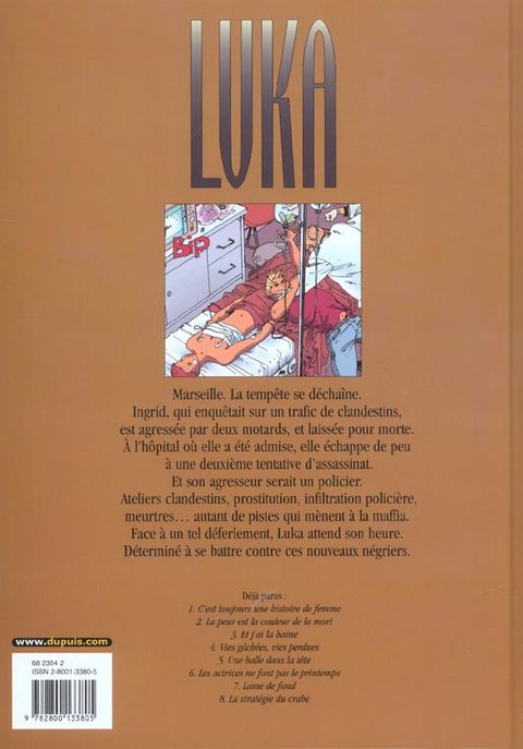Marseille. La tempête se déchaîne. ingrid, qui enquêtait sur un trafic de clandestins, est agressée par deux motards, et laissée pour morte. à l'hôpital oú elle a été admise, elle échappe de peu à une deuxième tentative d'assassinat. et son agresseur serait un policier. ateliers clandestins, prostitution, infiltration policière, meurtres. autant de pistes qui mènent à la maffia. face à un tel déferlement, luka attend son heure. Déterminé à se battre contre ces nouveaux négriers.