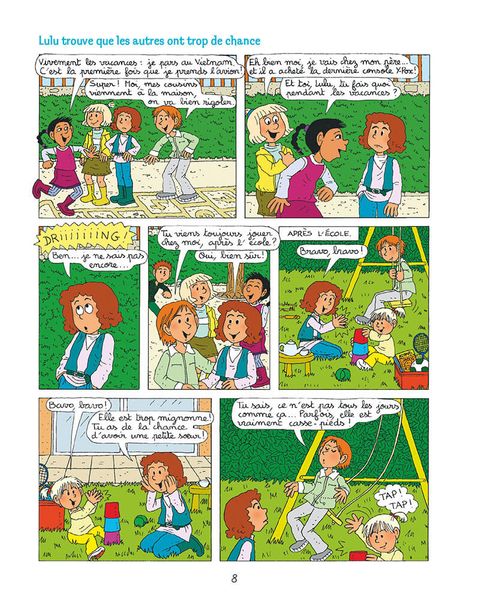 Lulu est comme tous les enfants : elle découvre la vie, ses joies et surtout... ses tracas. Heureusement, qu'il y a les parents, les amis, sa soeur aussi, mais ça c'est moins cool. Avec un peu de recul, tout problème trouve sa solution ! Prêt pour une nouvelle série de petites histoires de Lulu ? Elles se déroulent à l'école, à la maison, chez des amis... Que faire quand on oublie tout ? Quand on a un tic de langage ? Quand la nourriture n'est pas bonne à la cantine ?... Autant de situations qu'affrontent tous les enfants au quotidien, et qui trouveront ici des pistes de réponses. Heureusement, au milieu de tous ces petits soucis, Lulu a des amis fidèles ! Et ça, ça n'a pas de prix... En deux planches drôles et justes, Lulu montre comment résoudre les tracas du quotidien quand on est une petite fille de 9 ans. Le dessin classique et rassurant de Marylise Morel anime ces 25 histoires tendres, imaginées par trois scénaristes différentes.