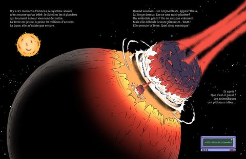 Il y a plus de 4 milliards d'année, le Système solaire n'est encore qu'un bébé. Quand soudain, un corps céleste percute la Terre. Quel choc cosmique ! De cette collision va naître l'astre qui fascine les humains depuis des millénaires : notre Lune. Une longue et périlleuse histoire, rythmée de pluies de météorites, d'envois de sondes vers sa face cachée, d'un premier grand pas pour l'humanité... à lire comme une aventure !