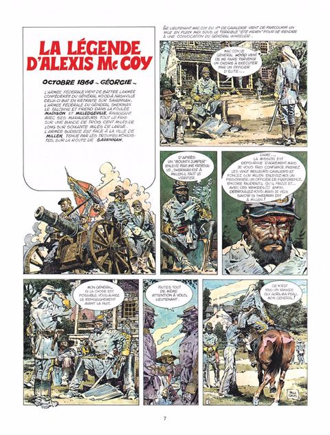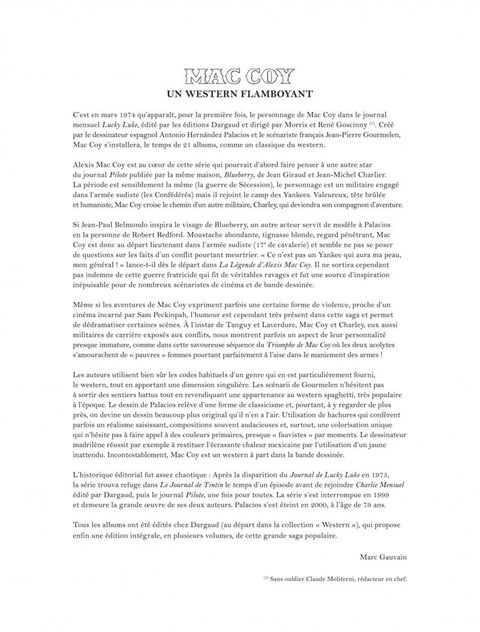 Alexis Mac Coy porte l'uniforme gris de l'armée des confédérés quand il est fait prisonnier par les nordistes. À la fin de la guerre de Sécession, il est réhabilité et, en raison de son courage, est nommé sergent-major à Fort Apache. Là, il retrouve son vieux copain Charley. Avec son visage de jeune premier, le lieutenant Mac Coy est un personnage tout en nuances. Il fait la guerre, se conduit parfois en héros, mais plutôt que de foncer tête baissée et d'obéir aveuglément aux ordres, sa technique, c'est de siroter une bonne bouteille, au calme, avant d'entamer le dialogue... C'est dans le mensuel Lucky Luke que sont publiées pour la première fois (1974) les aventures de Mac Coy ; elles paraîtront ensuite dans Tintin, Pilote et Charlie Mensuel.