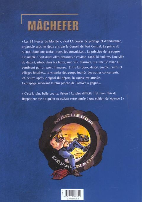 Les 24 heures du Monde, course de prestige et d'endurance, est organisée tous les 2 ans par le Conseil de Port Central. La prime de 50 000 doublons attise bien des convoitises. Le principe de la course est simple : deux villes, une de départ, située dans les terres, et une d'arrivée, sur une île, reliée à la côte par un immense pont, distantes d'environ 3000 kilomètres. Au bout de 24 heures, la course est arrêtée et l'équipe la plus près de la ville d'arrivée gagne. Depuis les origines de l'épreuve, un seul équipage a réussi à terminer la course (Maestro, copilote de Mâchefer, était à l'époque le pilote de cette équipe mythique). Le parcours est une grande ligne droite qui traverse plusieurs villages. Mâchefer participe à la course à la demande de Maestro, son copilote, qui lui a enseigné, ainsi qu'à Bothrops, l'art du pilotage, il y a plus de 20 ans. Ce maître, qui détient le fameux record de 23H56, sait que c'est sa dernière course; il n'a plus que quelques mois à vivre. En plus de l'équipage de Bothrops et Komodo, ils vont devoir affronter le grand favori : Honoré de la Chicane, un aristocrate des routes au comportement de gougnafier. Entre Mad Max et Satanas et Diabolo, Mâchefer participe à la course de sa vie...