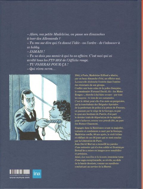 1944. Madeleine ? résistante, nom de code « Rainer » ? est arrêtée après avoir abattu un officier nazi. Un crime « terroriste », qui la condamne aux terribles interrogatoires des Brigades spéciales, la police de Vichy. Et plus particulièrement à ceux du commissaire Fernand David ? « David les Mains Rouges », traqueur d'« ennemis intérieurs » tels que les FTP-MOI du groupe Manouchian. Un préambule aux interrogatoires nazis, puis au terrifiant quotidien de la prison de Fresnes, avec pour seule échappatoire la perspective d'être fusillée... Torturée, encore et encore, Madeleine va-t-elle tenir, alors qu'à Paris bruisse des rumeurs sur la Libération ?« Madeleine, résistante », ou l'authentique destin de Madeleine Riffaud, qui revient cette fois avec une précision implacable sur les tortures qu'elle a endurées dans les geôles vichystes et nazies, avec au bout de supplice, enfin : la victoire.Mettre en scène la torture sans volonté de choquer mais aussi sans l'amoindrir. Voici le défi relevé avec un brio, de manière poignante, par Morvan et Bertail avec ce troisième tome.