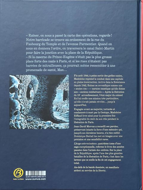 24 août 1944. Madeleine – alias Rainer – et ses camarades FFI de la Saint-Just sont brutalement tirés de leur sommeil par un milicien lâchement embusqué sur les toits parisiens. Une fillette innocente tombe sous ses balles. Folle de rage, Madeleine se lance alors elle-même sur les toits pour rendre justice… Elle reçoit ensuite une mission inattendue : éliminer un traître dont la réputation de résistant est pourtant intacte au sein des FFI. Une mission d'« ange exterminateur » si délicate que Madeleine Riffaud, disparue en 2024, gardera jusqu'au bout le secret de l'identité du traître, même face à Jean-David Morvan et Dominique Bertail. Avec Madeleine, résistante tome 4, vivez la libération de Paris à hauteur de combattante, puis les douloureux constats qui en découlèrent.La disparition de Madeleine Riffaud, en 2024, rend encore plus précieux ses souvenirs de témoin privilégié du XXe siècle. Mission que relèvent avec force et inspiration Bertail et Morvan !