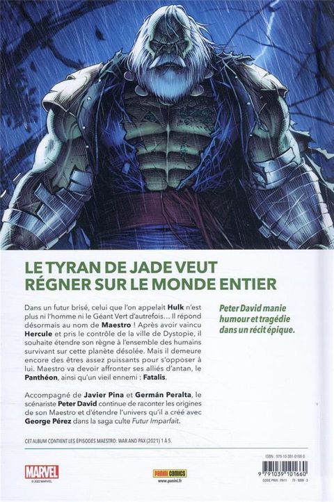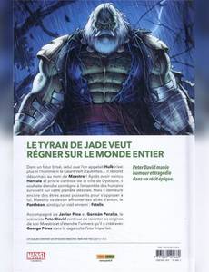 Le Maestro a renversé le précédent souverain de Dystopia, mais il ne compte pas s'arrêter en si bon chemin. Il est temps que la planète entière le reconnaisse comme son unique Dieu ! Mais celui qu'on appelait autrefois Hulk n'est pas le seul immortel sur Terre et le Panthéon va se dresser face à lui. Quel vilain bien connu se cache derrière cette équipe ? Il y a près de 20 ans, Peter David a créé un monde apocalyptique dominé par une version terrifiante de Hulk, dans la saga Futur Imparfait. L'histoire est devenue culte et le personnage a plusieurs fois refait surface dans l'univers Marvel. Après l'album MAESTRO paru en 2021, David revient raconter la suite des aventures du terrible tyran.