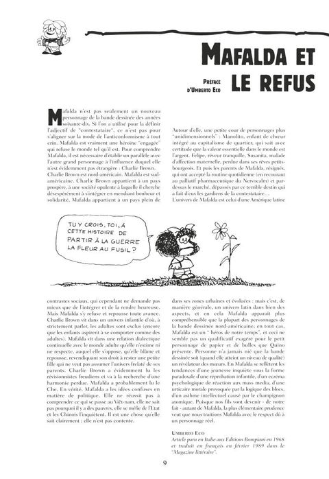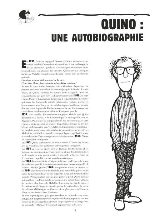 Intégrale des 12 albums de la série On ne présente plus Mafalda, petite fille vive qui découvre la vie, ses joies, ses absurdités et ses horreurs. À travers l'éveil d'un enfant Quino nous livre sa réflexion sur le monde et sur l'étrange animal qui le peuple : l'être humain. « Pour s'adapter aux goûts des Français nous avons mis en couleur les albums de Mafalda. Quino n'avait pas apprécié ce coloriage aussi voici la version d'origine, en noir et blanc, telle qu'elle fut publiée partout dans le monde ».