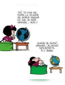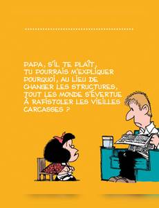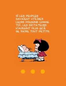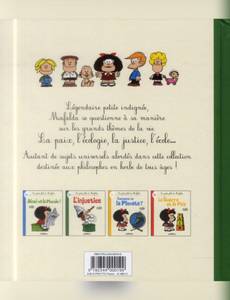 La petite philo de Mafalda : Mafalda se pose beaucoup de questions. Beaucoup trop, ce qui ne manque pas d'exaspérer ses proches. Ceux-ci, souvent dépassés par la maturité de l'enfant, ne savent pas répondre à ses interrogations toujours plus nombreuses. En 2014, Mafalda fête ses 50 ans ! Cette gamine à la tignasse brune, curieuse et avide de découvrir le monde, est devenue un emblème dans son pays d'origine, l'Argentine, mais aussi dans le monde entier ! En cinq décennies, elle aura marqué le monde de la bande dessinée grâce à son humour subtil et l'engagement contestataire de son auteur. À l'occasion de cet anniversaire exceptionnel, P'tit Glénat lance une série d'albums jeunesse pour faire partager aux tout-petits la philosophie et les initier aux grandes questions à travers le prisme de la petite héroïne intemporelle de Quino ! Ainsi, « La petite philo de Mafalda » comprendra 8 albums sur des thématiques universelles, dont les 4 premiers paraîtront en janvier 2014. La justice : S'il y a bien une chose au monde que Mafalda ne supporte pas (à part la soupe), c'est bien l'injustice. Que ce soit dans ses exposés de classe, dans la cour de récré ou à la maison, elle ne manque pas de nous le rappeler ! Alors pourquoi laisser la justice aux grands s'ils n'y comprennent rien ?