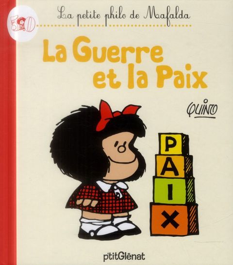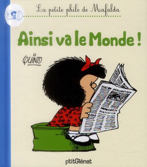 La petite philo de Mafalda : Mafalda se pose beaucoup de questions. Beaucoup trop, ce qui ne manque pas d'exaspérer ses proches. Ceux-ci, souvent dépassés par la maturité de l'enfant, ne savent pas répondre à ses interrogations toujours plus nombreuses. En 2014, Mafalda fête ses 50 ans ! Cette gamine à la tignasse brune, curieuse et avide de découvrir le monde, est devenue un emblème dans son pays d'origine, l'Argentine, mais aussi dans le monde entier ! En cinq décennies, elle aura marqué le monde de la bande dessinée grâce à son humour subtil et l'engagement contestataire de son auteur. À l'occasion de cet anniversaire exceptionnel, P'tit Glénat lance une série d'albums jeunesse pour faire partager aux tout-petits la philosophie et les initier aux grandes questions à travers le prisme de la petite héroïne intemporelle de Quino ! Ainsi, « La petite philo de Mafalda » comprendra 8 albums sur des thématiques universelles, dont les 4 premiers paraîtront en janvier 2014. La justice : S'il y a bien une chose au monde que Mafalda ne supporte pas (à part la soupe), c'est bien l'injustice. Que ce soit dans ses exposés de classe, dans la cour de récré ou à la maison, elle ne manque pas de nous le rappeler ! Alors pourquoi laisser la justice aux grands s'ils n'y comprennent rien ?