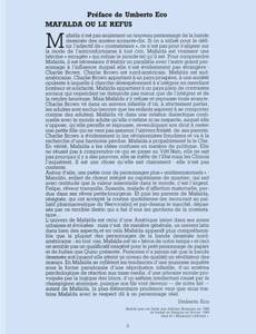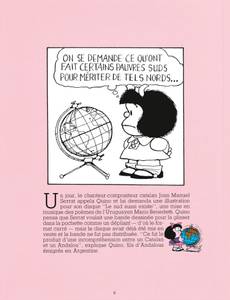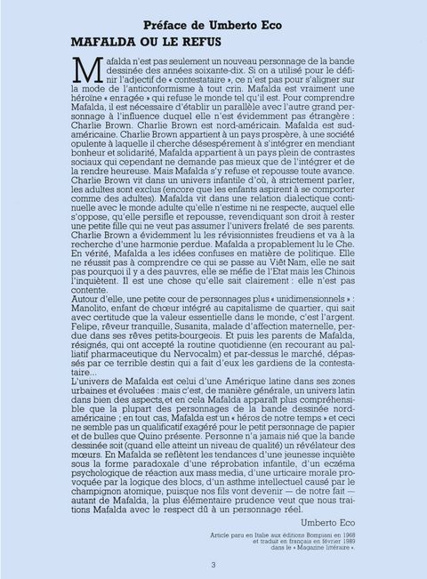 Mafalda, 47 ans, toutes ses dents et toujours aussi fraîche et impertinente ! On ne présente plus Mafalda, petite fille qui découvre la vie, ses joies, ses absurdités et ses horreurs. À travers l'éveil d'un enfant, Quino nous livre sa réflexion sur le monde et sur l'étrange animal qui le peuple : l'être humain. Quino donne naissance à Mafalda en 1964, personnage contestataire et anticonformiste de 10 ans, qui fera de lui un dessinateur mondialement reconnu. Les éditions Glénat poursuivent la réédition complète de cette série emblématique avec une nouvelle maquette sans aucun doute attrayante pour toutes les générations ! Petit bonus pour les inconditionnels, bibliophiles ou collectionneurs : cette réédition des aventures de Mafalda maintenant complétée, les tranches de tous les tomes rassemblés composent un dessin décoiffant ! Ce dernier tome de Mafalda propose une préface de Umberto Eco : "Mafalda ou le refus".