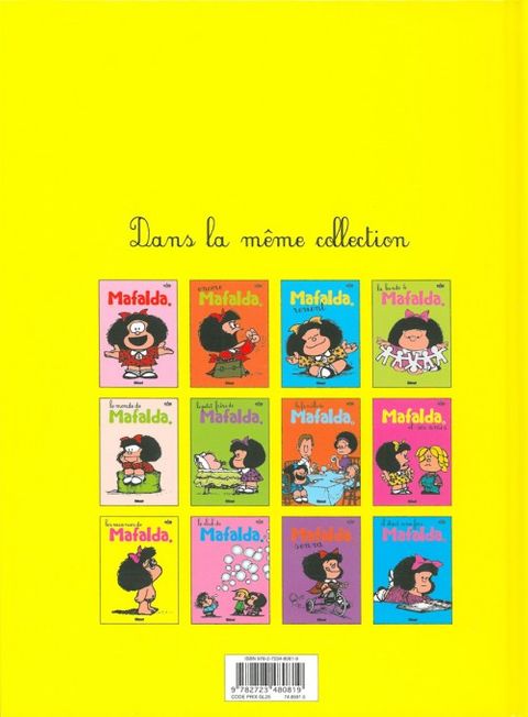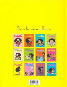 On ne présente plus Mafalda, petite fille qui découvre la vie, ses joies, ses absurdités et ses horreurs. À travers l'éveil d'un enfant, Quino nous livre sa réflexion sur le monde et sur l'étrange animal qui le peuple : l'être humain. Quino donne naissance à Mafalda en 1964, personnage contestataire et anticonformiste de 10 ans, qui fera de lui un dessinateur mondialement reconnu.Les éditions Glénat poursuivent la réédition complète de cette série emblématique avec une nouvelle maquette sans aucun doute attrayante pour toutes les générations ! Petit bonus pour les inconditionnels, bibliophiles ou collectionneurs : une fois la série complète rééditée (janvier 2012), les tranches de tous les tomes rassemblés composeront un dessin décoiffant !
