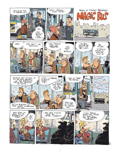 Bercovici au dessin (Les femmes en blanc, Cactus Club, etc) et Thiriet au scénario (Fluide Glacial, Spirou, l’Association, etc.) s’associent pour un nouveau projet enthousiasmant : Magic Bus. Le livre est une succession de saynètes se déroulant dans des bus. Les situations imaginées par Thiriet sont pleines d’humour et de vie, toujours astucieuses, et parfaitement mises en évidence par le dessin de Bercovici. Destinée à tous les publics, la série est particulièrement prometteuse.