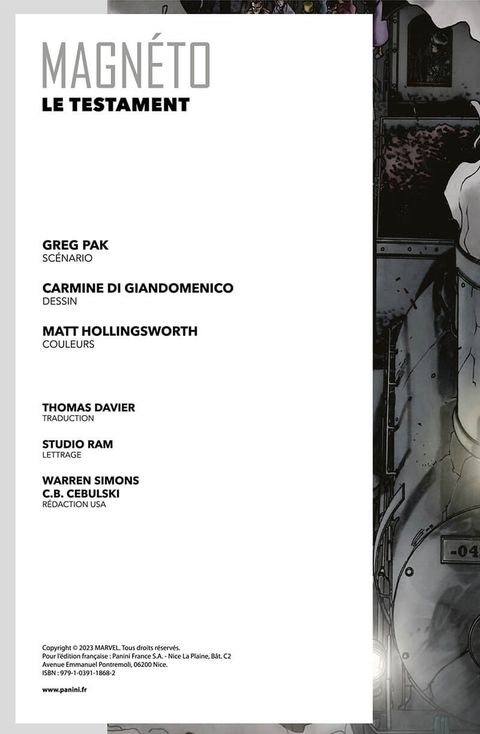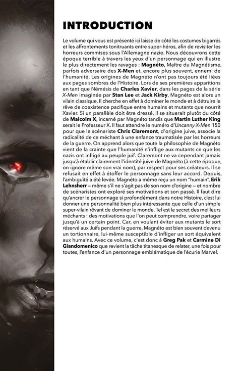 Découvrez la véritable histoire de Magneto, bien avant qu'il ne devienne l'ennemi des X-Men. Enfant durant la Seconde Guerre mondiale, ce simple écolier va devoir lutter pour survivre face aux soldats nazis et à la «solution finale» ordonnée par Hitler. Un récit bouleversant qui retrace les origines d'un des plus célèbres personnages Marvel. Par Greg Pak (Red Skull) et Carmine Di Giandomenico (Daredevil: Battlin' Jack Murdock, Spider-Man Noir).