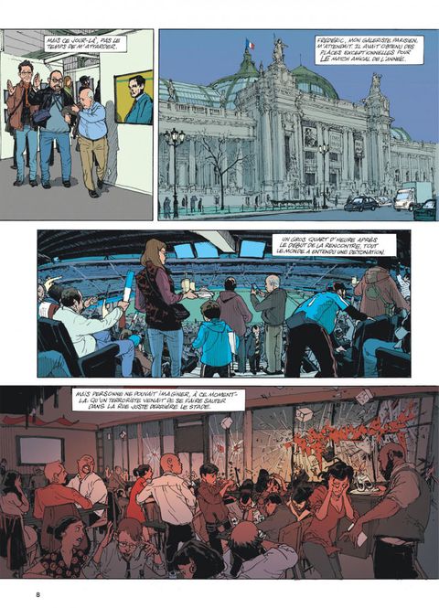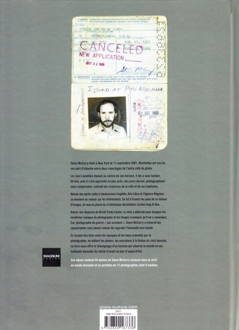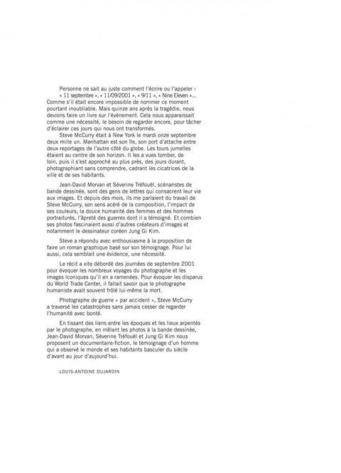 Steve McCurry était à New York le 11 septembre 2001. Manhattan est son île, son port d'attache entre deux reportages de l'autre côté du globe. Les tours jumelles étaient au centre de son horizon. Il les a vues tomber, s'est approché au plus près, photographiant sans comprendre, cadrant les cicatrices de la ville et de ses habitants. Quinze ans après cette tragédie, Aire Libre et l'Agence Magnum se devaient de revenir sur les événements ; ce sera à travers les yeux de ce faiseur d'images, et sous la plume du si talentueux dessinateur coréen Jung Gi Kim. Construit autour des disparus du World Trade Center, le récit déborde pourtant pour évoquer les nombreux voyages de ce photographe de guerre "par accident" et les images iconiques qu'il en a ramenées. Mêlant presque 80 photographies (dont huit clichés inédits) et des entretiens à la fiction, McCurry NY 11 septembre 2001 nous offre le témoignage d'un homme qui observe le monde et ses habitants basculer du siècle d'avant au jour d'aujourd'hui.