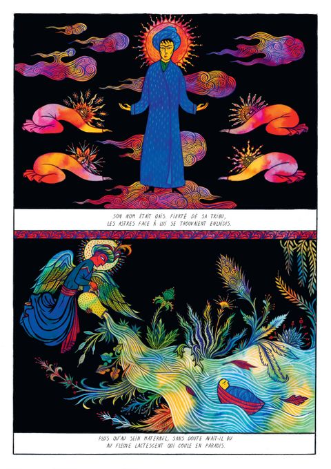 L'histoire de "Majnoun et Leïli - Chants d'outre-tombe" pourrait se résumer sur 3 lignes ; cet œuvre est tout d'abord contemplative avec de grandes fresques colorées, des représentations oniriques et surtout un travail plaisant d'écriture par des poèmes à rimes riches et en continu au fils des pages. Le texte (...) Voir le commentaire