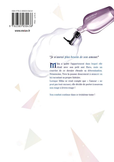 "Je n'aurai plus besoin de son amour."Miku a quitté l'appartement dans lequel elle vivait avec son petit ami Haru, mais un courrier de ce dernier ébranle sa détermination. Néanmoins, Yves la pousse doucement à avancer en lui racontant sa propre histoire. Lorsque Miku se rend compte que " l'amour " ne peut pas tout excuser, elle décide de porter à nouveau son rouge à lèvres rouge !