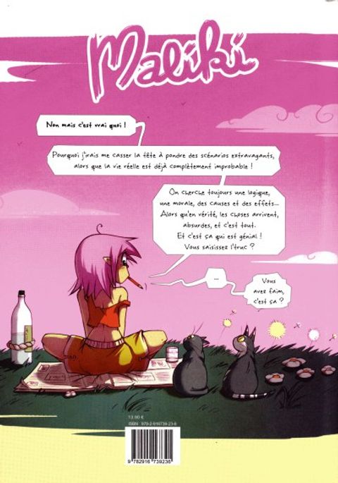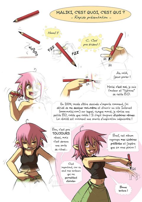 La jeune et jolie Maliki, charmante fille à tendance manga auxoreilles pointues, nous raconte sa vie en la dessinant dans des strips chargés d'humour du quotidien, parfois noir, souvent hilarant. Ce livre est un recueil d'anecdotes et de tranches de vie. On y aborde la cohabitation épique humains-chats, l'animal le plus tyrannique de la planète. On parle de l'enfance, partagée entre rêveries sucrées et trauma profonds. Et plus généralement, on constate l'incroyable ironie de la réalité, qui est toujours bien plus extraordinaire que n'importe quelle fiction.