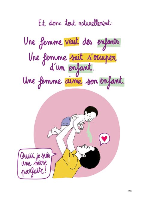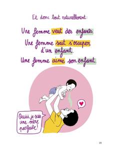 Petit précis de déconstruction de l'instinct maternel. Le mot de l'auteur : « Petite j'étais persuadée qu'il fallait avoir des enfants. A 15 ans, je pensais que je serai mère à 20 ans, à 20 ans je pensais que ça serait vers 25 ans. Et puis j'ai rencontré des gens qui pensaient autrement et qui questionnaient la charge sociale de l'obligation de maternité. J'ai commencé à me demander si moi, j'en voulais vraiment. Ce que ça signifiait et pourquoi on le faisait ? J'étais très mitigée sur le sujet. Et puis un jour, à 29 ans, j'ai eu le cancer. En même temps que l'annonce de la maladie, on m'a prévenu que les traitements allaient probablement me rendre stérile. Là, tout d'un coup, ça a été comme si on m'ôtait un jouet et que tout ce que je voulais c'était ce jouet-là ! Quatre ans plus tard, me voilà enceinte. À travers ma propre maternité, je veux interroger le fameux instinct maternel, l'explorer du point de vue philosophique, culturel, historique ; mais aussi aborder les différents types de parentalité, à travers d'autres témoignages. En bref : c'est quoi l'instinct maternel ? Et est-ce qu'il existe vraiment ? »