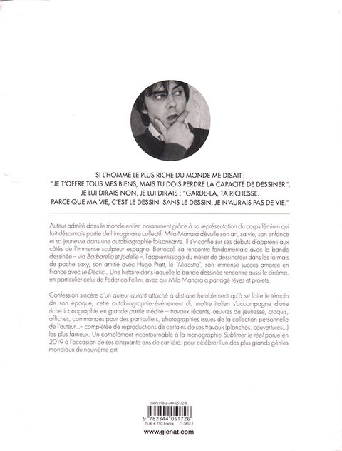 L'amour du dessin … quand Milo Manara se livre.Auteur admiré dans le monde entier, notamment grâce à sa représentation du corps féminin qui fait désormais partie de l'imaginaire collectif, Milo Manara dévoile son art, sa vie, son enfance et sa jeunesse dans une autobiographie foisonnante. Il s’y confie sur ses débuts d’apprenti aux côtés de l’immense sculpteur espagnol Berrocal, sa rencontre fondamentale avec la bande dessinée – via Barbarella et Jodelle–, l'apprentissage du métier de dessinateur dans les formats de poche sexy, 1968, son amitié avec Hugo Pratt, le "Maestro", son immense succès amorcé en France avec Le Déclic… Une histoire dans laquelle la bande dessinée rencontre aussi le cinéma, en particulier celui de Federico Fellini, avec qui Milo Manara a partagé des projets et des rêves.Confession sincère d'un auteur autant attaché à distraire humblement qu’à se faire le témoin de son époque, cette autobiographie événement dumaître italien s’accompagne d’une riche iconographie en grande partie inédite : travaux récents, œuvres de jeunesse, dessins humoristiques, croquis, affiches, commandes pour des particuliers, photographies issues de la collection personnelle de l’auteur… complétée de reproductions de certains de ses travaux (planches, couvertures…) les plus fameux. Un complément incontournable à la monographie Sublimer le réel parue en 2019 à l’occasion de ses cinquante ans de carrière, pour célébrer l’un des plus grands génies mondiaux du neuvième art.