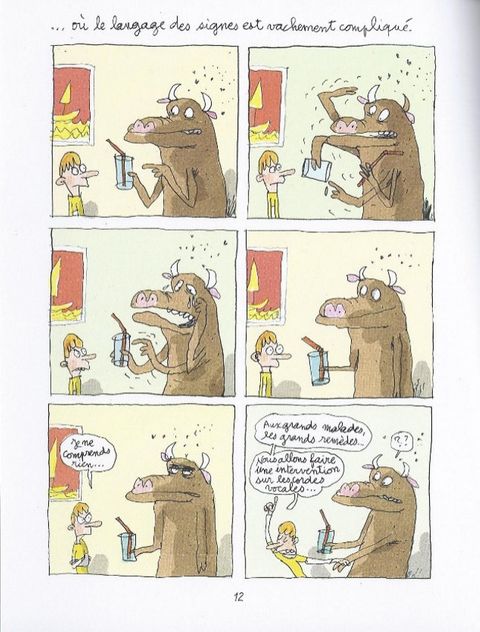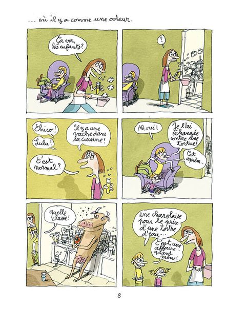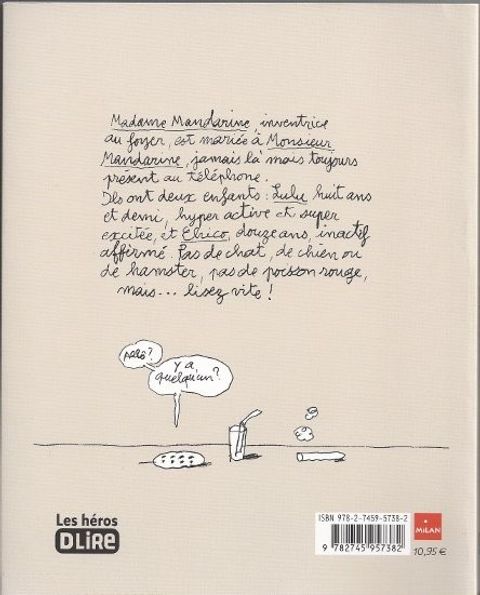 Dans la famille Mandarine, je demande la mère sévèrement atteinte de « delirium inventoris », qui accumule les trouvailles scientifiques dans l’attente du prix Nobel… Et le père, toujours en déplacement professionnel, ou plutôt toujours présent au téléphone… Ou encore Lulu, maniaque petit bout de fille à couettes, aussi adorable avec tous qu’horripilante avec son grand frère Chico, un ado mollasson dont la vie est duuure… Ah, j’oubliais la vache, bien sûr : un animal parlant (grâce à madame Mandarine), impitoyable compagnon de jeu et (très) légèrement accro au jus d’orange…