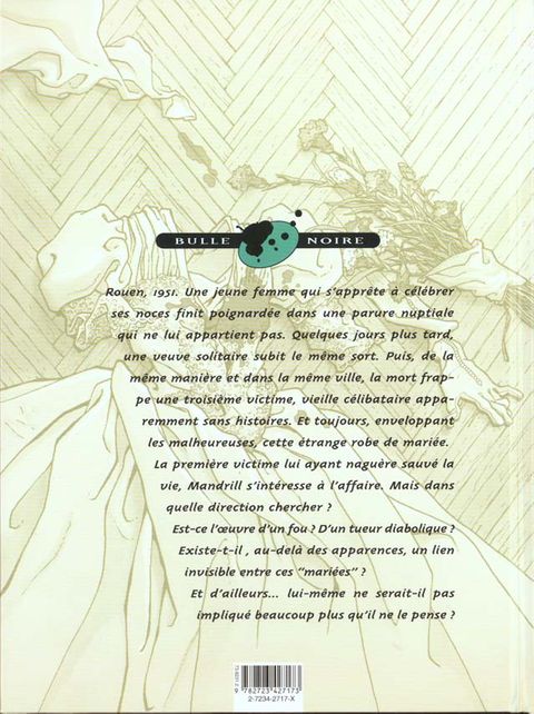 1951 : des enfants découvrent le cadavre d'une jeune femme vêtue de sa robe de mariée. En apprenant la nouvelle par les journaux, Mandrill reconnaît la victime : Marielle Floquet, une amie qui lui avait sauvé la vie à l'époque du Maquis. Mandrill est ému par ce triste fait divers qui se transforme en une affaire mystérieuse le jour où un second cadavre est découvert dans les mêmes circonstances... Frank Giroud, le père du célèbre Louis La Guigne, campe avec Mandrill un nouveau personnage haut en couleur et doté d'un excellent crochet du droit ! Animée par le trait agréable de Barly Baruti, cette série policière rappelle les oeuvres de Léo Malet ou de Boileau et Narcejac, et reconstruit avec un plaisir évident le Paris des années 50.