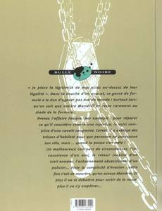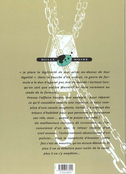 « Grande gueule, oui ! Cabochard, tête brûlée, coureur de jupons... d'accord, mais assassin, sûrement pas ! » Voilà ce pense Angèle de son patron l'avocat Adrien Mandrill. Mais pourtant celui-ci est dans le pétrin. Il est soupçonné d'avoir tué sa maîtresse et vient d'être placé en garde à vue au Quai des Orfèvres. S'il clame son innocence, le commissaire Vaneker, chargé de l'enquête, possède suffisamment d'éléments pour demander son inculpation. Et lorsque Mandrill commence à recevoir des lettres d'un corbeau et qu'il apprend que l'homme pouvant l'innocenter vient d'être assassiné, il commence à se faire du mouron... Et il a bien raison... Frank Giroud, le père du célèbre Louis La Guigne, campe avec Mandrill un personnage haut en couleur et doté d'un excellent crochet du droit ! Animée par le trait de plus en plus affiné de Barly Baruti, cette série policière rappelle les oeuvres de Léo Malet ou de Boileau et Narcejac, et reconstruit avec un plaisir évident le Paris des années 50.