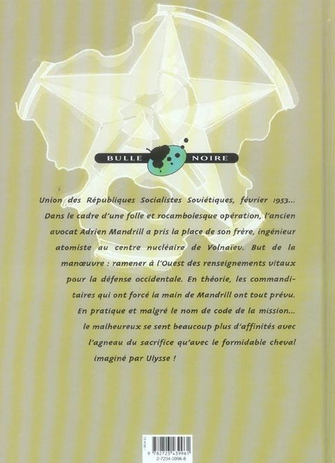 « Nom de code de l'opération : "Cheval de Troie". Il s'agit de : a) convaincre Adrien Mandrill de collaborer avec nous, en utilisant au besoin tous les moyens de coercition nécessaires ; b) faire croire à la mort dudit Mandrill lors d'une évasion manquée ; c) procéder dans un délai de six mois à sa « transformation » complète ; d) préparer parallèlement et avec la plus grande minutie une opération commando sur la mer Noire, plus précisément à Malenski, lieu de villégiature hebdomadaire des ingénieurs de Volnaïev ; e) lancer l'opération et procéder au cours de celle-ci à l'échange entre les deux frères. » En février 1953, Mandrill est donc au centre de recherches nucléaires de Volnaïev, en lieu et place de son frère. S'il parvient à récupérer les microfilms pour lesquels l'OTAN l'a envoyé là-bas, il est dans l'incapacité de contacter son informateur sur place, et donc de s'enfuir... Comment quitter ce bourbier russe sain et sauf oe... Bon courage, Mandrill... Suite directe du tome 5, « Le Cheval de Troie » est un épisode passionnant de bout en bout, scénarisé et dessiné de mains de maîtres.