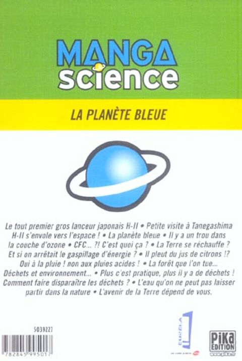 le tout premier gros lanceur japonais h-ll. petite visite à tanegashima h-ll s'envole vers l'espace ! la planète bleue. il y a un trou dans la couche d'ozone. cfc. ? ! c'est quoi ça ? la terre se réchauffe ? et si on arrêtait le gaspillage d'énergie ? il pleut du jus de citrons ! ? oui à la pluie ! non aux pluies acides ! la forêt que l'on tue. déchets et environnement. plus c'est pratique, plus il y a de déchets ! comment faire disparaître les déchets ? l'eau qu'on ne peut pas laisser partir dans la nature. l'avenir de la terre dépend de vous.