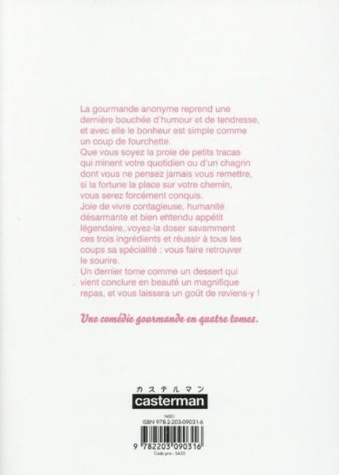 La gourmande anonyme reprend une dernière bouchée d’humour et de tendresse. Avec elle il n’y a pas un problème qu’une bonne dégustation ne peut pas régler. Les petits tracas, les malheurs qui sont trop dures à affronter, son bonheur évident en mangeant réchauffera et réconfortera les âmes en difficultés. Une bouchée de plaisir qui achève en beauté cette série d’humour qui n’a pas oubliée d’être humaine.