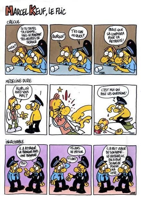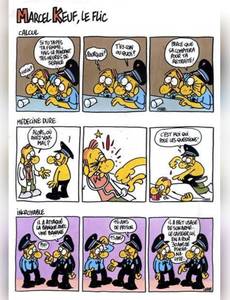Marcel est un mauvais flic, bête et méchant, raciste, vulgaire, vénal, prétentieux, violent, arbitraire... qui a ses fans chez les lecteurs de Fluide Glacial depuis des années. Qu'il cogne sur les civils, qu'il renvoie les sans-papiers dans leur pays ou qu'il se contente de refaire le monde, il a toujours le mot de trop. Un voyage décapant dans ce que la société fait de plus médiocre! Marcel Keuf sévit dans Fluide Glacial, sous forme de strips mensuels.