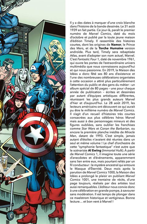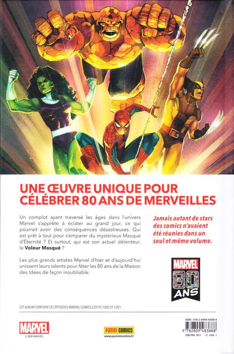 Chacune des 80 pages de Marvel Comics 1 000 évoque l'une des 80 années écoulées depuis la création de la Maison des Idées. Outre les héros Marvel, on retrouve Conan le Barbare, Dark Vador et Miracleman. Le récit bonus Marvel Comics 1 001 est également inclus. 80 ans après Marvel Comics 1, Marvel propose un numéro 1 000 incroyable. 80 équipes créatives exceptionnelles revisitent l'histoire de la Maison des Idées à travers un récit imaginé par Al Ewing qui dévoile les mystères du Masque d'Éternité. Retrouvez Neil Gaiman, Alex Ross, Walt Simonson, Erik Larsen, Jason Latour, Jeph Loeb, J. Michael Straczynski, John Cassaday, Mike Allred, les époux Immonen, Kareem Abdul-Jabbar, Jim Cheung, Gail Simone, les réalisateurs de Spider-Man: New Generation, Mike Deodato Jr, Charles Soule, Mark Waid et des dizaines d'autres créateurs pour le projet le plus ambitieux de l'histoire des comics.