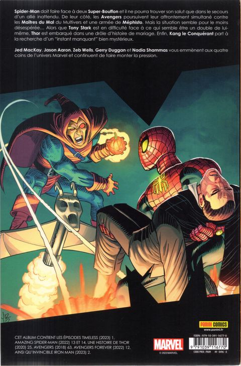 Kang revient dans les pages de MARVEL COMICS pour nous donner un aperçu du futur. Que présage l'avenir pour les héros Marvel ? Vous allez le découvrir ! Spider-Man voit un de ses pires ennemis s'allier à un adversaire des X-Men. Ça sent le crossover ! Et puisqu'on en parle, l'affrontement entre toutes les équipes d'Avengers du multivers et les Maîtres du Mal de Méphisto se poursuit. Quant à Thor, il part sur la piste de Corvus Glaive pour comprendre ses visions concernant Thanos. Encore du changement ce mois-ci ! Jed Mackay, le futur scénariste des Avengers (ce sera en novembre) se penche sur l'avenir de l'univers Marvel. Jason Aaron poursuit sa dernière saga des Avengers. En plus, Amazing Spider-Man vous présente le prologue d'une saga Spidey / X-Men, Dark Web, qui nous tiendra en haleine à partir du mois prochain dans un mensuel à part, et Thor commence une nouvelle saga !