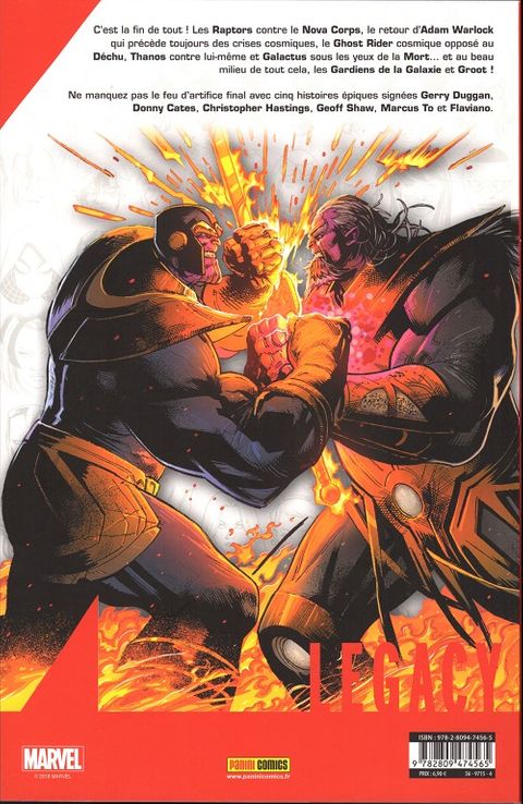 C’est la fin de tout ! Les Raptors contre le Nova Corps, le retour d’Adam Warlock qui précède toujours des crises cosmiques, le Ghost Rider cosmique opposé au Déchu, Thanos contre lui-même et Galactus (!!) sous les yeux de la Mort… et au beau milieu de tout cela, les Gardiens de la Galaxie et Groot ! Ne manquez pas le feu d’artifice final avec 5 histoires épiques signées Gerry Duggan, Donny Cates, Christopher Hastings, Geoff Shaw, Marcus To et Flaviano. Contient les traductions françaises des épisodes US suivants : Guardians of the Galaxy 150 Thanos (2017) 16 à 18 I Am Groot 5