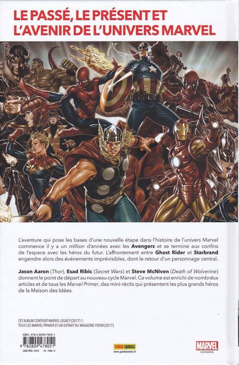 Retrouvez les origines de tous les héros Marvel ! Ils sont tous là : les plus iconiques (Peter Parker, les Avengers, Deadpool...), les plus récents (Thor sous l’identité de Jane Foster, Miles Morales, Miss Marvel) et les moins connus (comme America, Gwenpool ou Moon Girl). Découvrez également un récit de cinquante pages sur les Avengers de la préhistoire signé par Jason Aaron, Esad Ribic et Steve McNiven. Contient : Marvel Legacy 1, Primers Pages tirés de 47 séries.