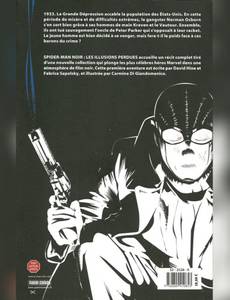1933. La Grande Dépression accable la population des Etats-Unis. En cette période de misère et de difficultés extrêmes, le gangster Norman Osborn s'en sort bien grâce à ses hommes de main Kraven et le Vautour. Ensemble, ils ont tué sauvagement l'oncle de Peter Parker qui s'opposait à leur racket. Le jeune homme est bien décidé à se venger, mais fera-t-il le poids face à ces barons du crime. Spider-man noir : les illusions perdues accueille un récit complet tiré d'une nouvelle collection qui plonge les plus célèbres héros Marvel dans une atmosphère de film noir. Cette première aventure est écrite par David Hine et Fabrice Sapolsky, et illustrée par Carmine Di Giandomenico.