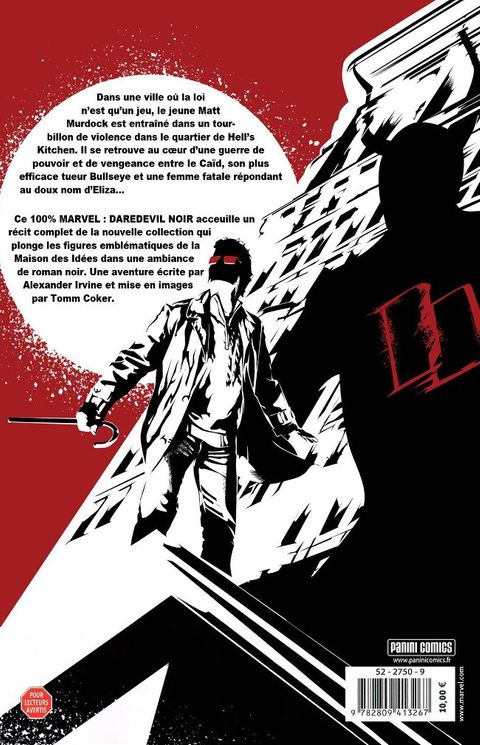 C'est au tour de Daredevil d'expérimenter l'étonnante gamme «noir» de la Maison des Idées. Au temps de la prohibition, Hell's Kitchen est le territoire du puissant Caïd dont le seul obstacle est un héros masqué répondant au nom de Daredevil. Mais tout se complique lorsqu'Orville Halloran sort de prison. Le criminel est en effet bien résolu à prendre la place du Caïd. Et lorsque le détective privé Foggy Nelson et son assistant Matt Murdock reçoivent une femme désespérée qui leur raconte une histoire concernant Halloran, Matt décide de faire du truand la nouvelle cible de Daredevil. Un polar signé Alexander Irvine et Tom Coker.