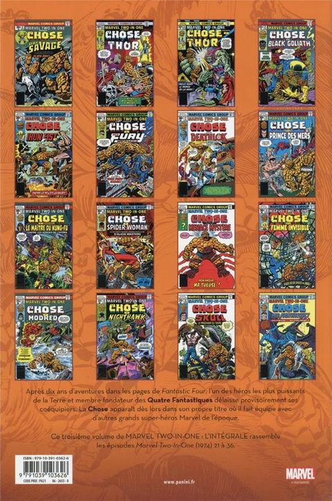 La Chose continue de faire équipe avec les plus surprenants personnages Marvel ! Thor, Iron Fist, Shang-Chi mais aussi Doc Savage et Goliath font partie des protagonistes de ces aventures toujours imprévisibles ! Jamais rééditées depuis les années 70-80, ces aventures de la Chose en marge des Quatre Fantastiques ont passionné toute une génération de lecteurs de Titans et de Spécial Strange. Le principe est semblable à celui de Spider-Man Team-up : Ben Grimm fait équipe à chaque épisode avec un héros différent !