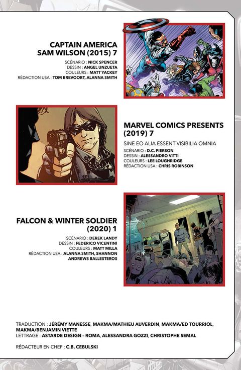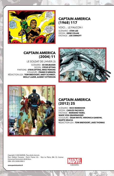 Quelle que soit la situation, quels que soient les dangers auxquels il fait face, Steve Rogers, alias Captain America, sait qu'il peut toujours compter sur ses deux indéfectibles amis : Sam Wilson, le Faucon, et Bucky Barnes, le Soldat de l'Hiver. Ces six histoires courtes empruntées à différentes époques montrent en quoi ces deux héros sont les dignes successeurs de la Légende Vivante. Découvrez aussi le premier épisode - inédit - de la nouvelle série qui leur est consacrée et qui les voit confrontés à une réémergence de l'Hydra, la terrible organisation terroriste ! Avec Le Faucon & le Soldat de l'Hiver, les abonnés à Disney+ ont enfin pu découvrir la première des séries Marvel spécialement réalisées pour la plateforme de streaming. Sam Wilson et Bucky Barnes n'étant pas les héros les mieux identifiés dans l'univers des comics, nous proposons à nos lecteurs ces épisodes fétiches où ces deux personnages jouent un rôle prépondérant.