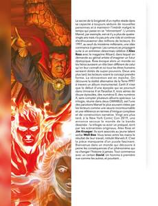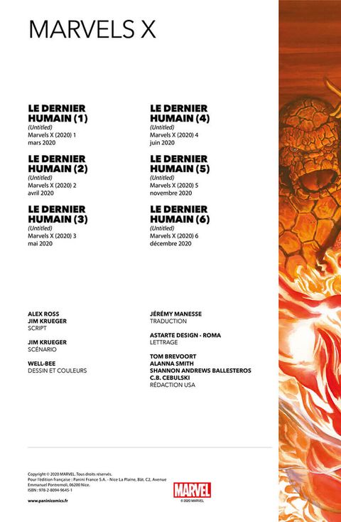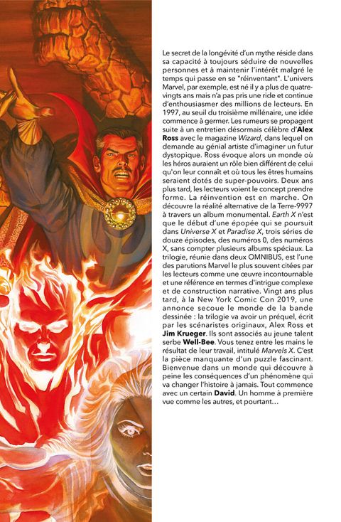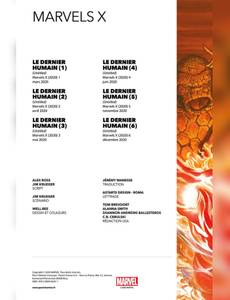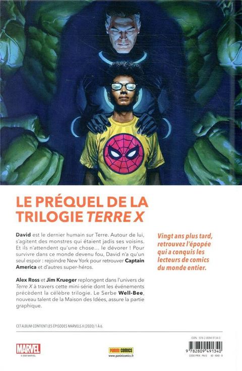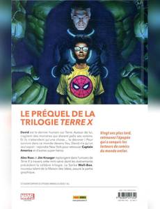 Être l'unique humain « normal » dans un monde peuplé de personnes douées de super-pouvoirs. C'est l'histoire de David, le dernier homme ordinaire vivant sur la Terre, racontée dans la saga Earth X. Traqué par ses anciens voisins qui ne le voient plus que comme une proie, David part à New York, à la recherche des héros Marvel. Il découvre qu'ils sont tués les uns après les autres, et bien malgré lui, notre protagoniste va se retrouver plongé au coeur d'une saga essentielle, jamais racontée jusqu'ici. Pour le plus grand bonheur des fans, Alex Ross et Jim Krueger se retrouvent enfin ! Les deux cerveaux de la trilogie Earth X (rééditée en deux tomes dans la collection MARVEL OMNIBUS en novembre) nous offre le prequel à leur célébrissime une saga. Contient les épisodes US de Marvels X (2020) #1-6.