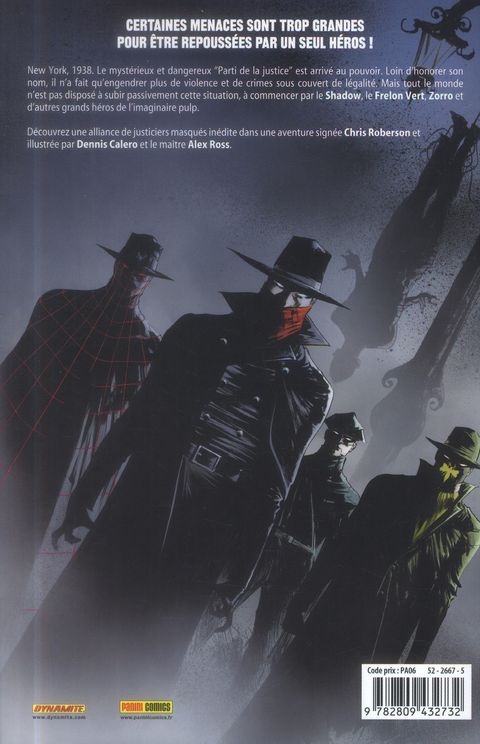 Depuis quelques années, Dynamite fait sensation en donnant une nouvelle vie aux héros de notre enfance. Aujourd'hui, l'explosive compagnie va encore plus loin en rassemblant Shadow, Green Hornet, Kato, Spider et Zorro au sein d'une même équipe, dans une mini-série en huit épisodes ! Le génial Alex Ross signe les couvertures et le premier épisode de cette saga qui va faire sensation.