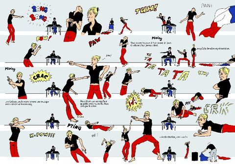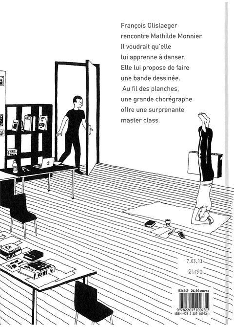 Mathilde écrit : "C'est en 2008, au Festival d'Avignon, que j'ai vu pour la première fois les dessins de François Olislaeger. J'ai tout de suite été frappée par ce travail qui, mieux que la photo, offrait à mes yeux la possibilité de représenter la danse. Non seulement ces images rendaient aux mouvements et à la scène tout leur espace, mais elles permettaient d'intégrer des textes, pour moi essentiels car liés à l'enjeu de mes spectacles. Il existe peu de livres de dessins sur la danse et encore moins de BD. Pourtant, la plupart des chorégraphes dessinent pour mémoriser leurs idées. J'ai senti qu'il avait là matière à un magnifique projet éditorial, un support d'invention et de créativité susceptible de prolonger et d'élargir mon travail scénique…"