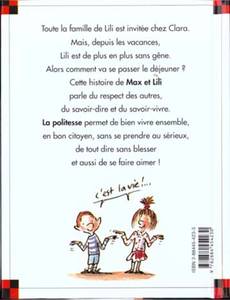 Toute la famille de Lili est invitée chez Clara. Mais, depuis les vacances, Lili est de plus en plus sans gêne. Alors comment va se passer le déjeuner ? Cette histoire de Max et Lili parle du respect des autres, du savoir-dire et du savoir-vivre. La politesse permet de bien vivre ensemble, en bon citoyen, sans se prendre au sérieux, de tout dire sans blesser et aussi de se faire aimer !
