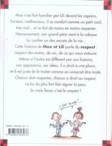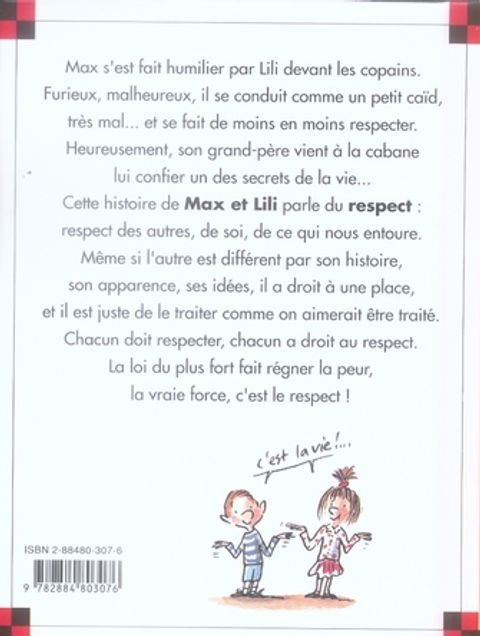 Max s'est fait humilier par Lili devant les copains. Furieux, malheureux, il se conduit comme un petit caïd, très mal... et se fait de moins en moins respecter. Heureusement, son grand-père vient à la cabane lui confier un des secrets de la vie... Cette histoire de Max et Lili parle du respect : respect des autres, de soi, de ce qui nous entoure. Même si l'autre est différent par son histoire, son apparence, ses idées, il a droit à une place, et il est juste de le traiter comme on aimerait être traité. Chacun doit respecter, chacun a droit au respect. La loi du plus fort fait régner la peur, la vraie force, c'est le respect !