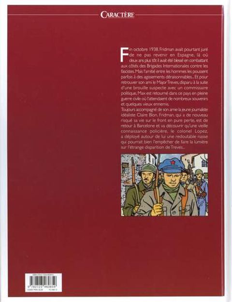 Fridman avait pourtant juré de ne pas revenir en Espagne, là où deux ans plus tôt il avait été blessé en combattant aux côtés des brigades internationales contre les fascistes. Mais l'amitié entre les hommes les poussent parfois à des agissements déraisonnables... Et pour retrouver son ami le Major Treves, disparu à la suite d'une brouille suspecte avec un commissaire politique, Max est retourné dans ce pays en pleine guerre civile, où l'attendaient de nombreux souvenirs et quelques vieux ennemis. Toujours accompagné de son amie la jeune journaliste idéaliste Claire Blon, Fridman, qui a de nouveau risqué sa vie sur le front en pure perte, est de retour à Barcelone. Il va découvrir qu'une vieille connaissance policière, le colonel Lopez, a déployé autour de lui une redoutable nasse qui pourrait bien l'empêcher de faire la lumière sur l'étrange disparition de Treves...